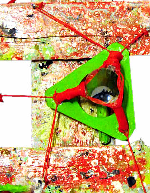mixed media, wood, threads, plastic, enamel paint, magnifying glass and a plastic eye
