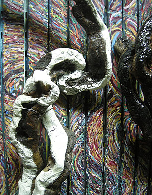 mixed media, plastic shutter, wooden door, sea woods and oil